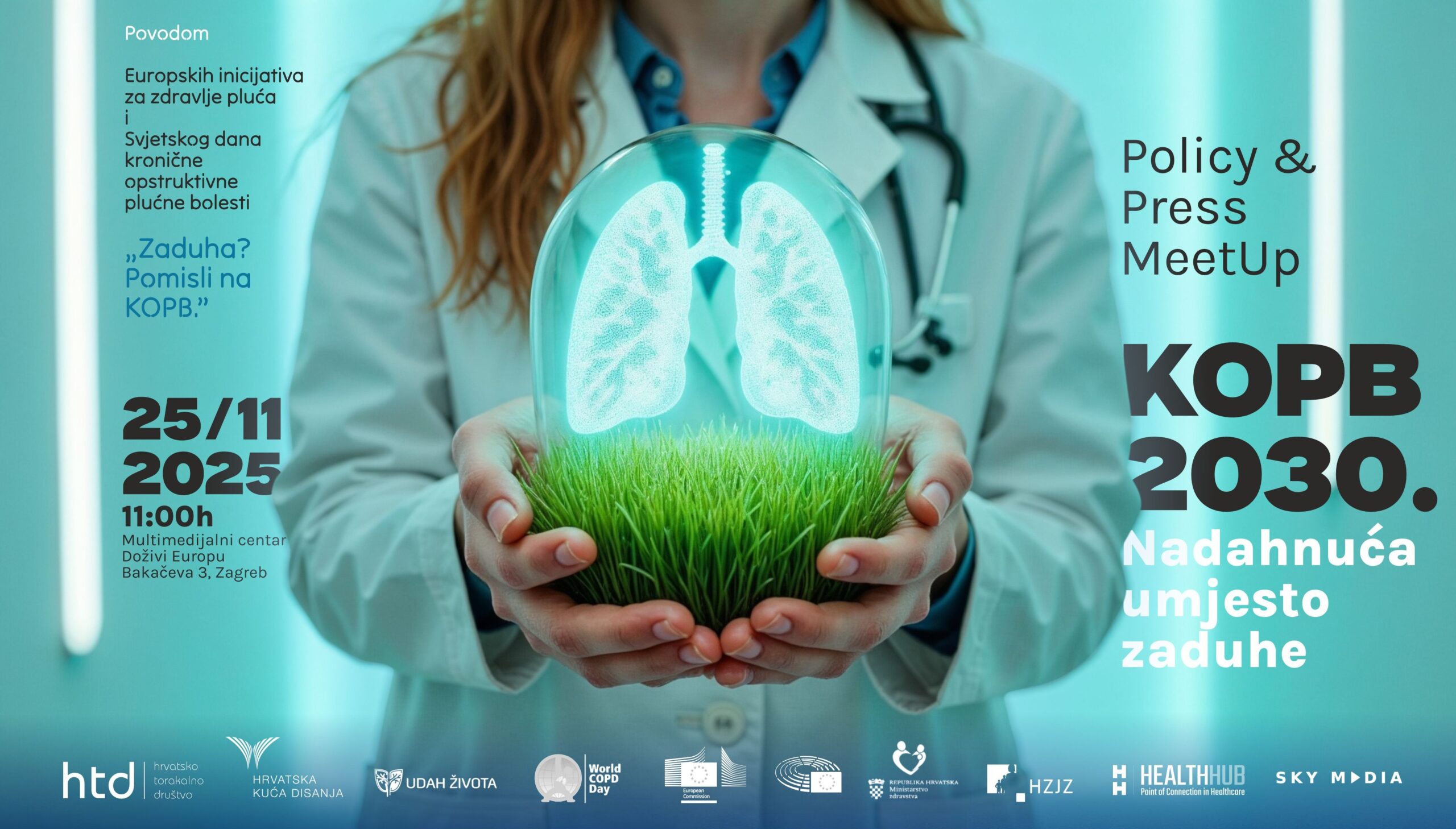 Čast nam je pozvati Vas na Policy & Press MeetUp «KOPB 2030. – Nadahnuća umjesto zaduhe», povodom Svjetskog dana kronične opstruktivne plućne bolesti (KOPB), u organizaciji Hrvatske kuće disanja, Hrvatskog torakalnog društva i Udruge „Udah Života” uz podršku Health Hub-a.